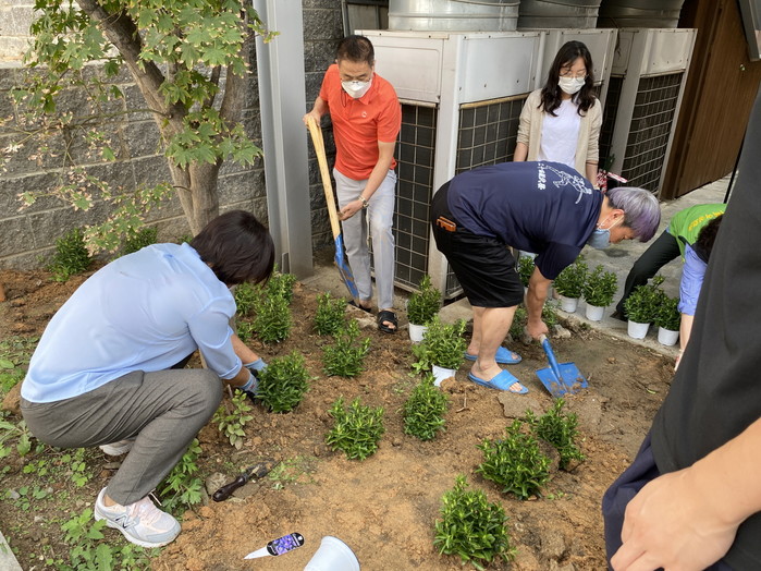경기 수원시 시민들이 ‘용담 안점순 기억의 방’ 주변에 고 안점순 할머니를 기리며 용담(龍膽) 화단을 조성했다. 용담은 일본군 위안부 피해자인 안 할머니(1928~2018년)가 생전에 좋아했던 꽃이다. 사진은 9일 용담 안점순 기억의 방 주변 화단에 용담을 심고 있는 모습. (사진제공=수원시청)