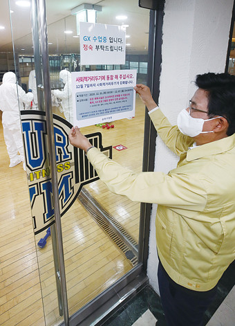 국내 코로나19 ‘3차 대유행’ 확산세를 억제하기 위해 수도권의 방역 조처가 한층 강화된 첫날인 1일 서울 송파구의 한 피트니스센터 줌바 교습실에서 박성수 구청장이 사회적 거리두기 동참 안내문을 붙이고 있다.