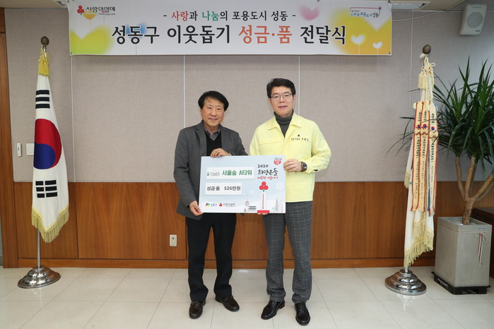서울 성동구에 위치한 서울숲A타워는 최근 ‘희망온돌 따뜻한 겨울나기 사업’에 참여해 100만원의 성금과 백미·라면 등 240만원 상당 성품을 서울사회복지공동모금회를 통해 전달했다. 사진은 정원오 구청장(오른쪽)과 관계자가 기념촬영을 하는 모습. (사진제공=성동구청)
