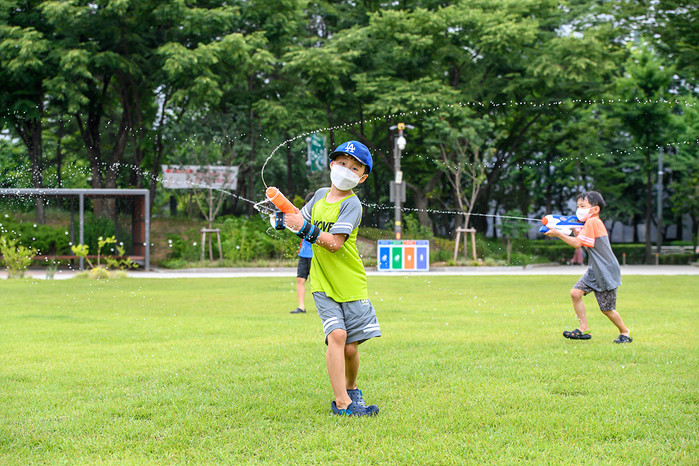 서울 양천구 대표공원인 양천공원 중앙잔디광장에서 24일 한낮의 무더위 속 아이들이 물총놀이를 하고 있다. 양천공원은 지난해 리모델링을 통해 중앙잔디광장·책쉼터 등을 새로 조성해 많은 주민이 즐겨 찾고 있다. 사진은 어린이들이 시원하게 물총놀이를 하고 있는 모습. (사진제공=양천구청)