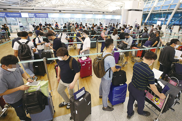 22일 오전 인천국제공항 1터미널 출국장에서 기업인들이 베트남행 전세기 탑승수속을 위해 줄을 서 기다리고 있다. 이날 중소·중견기업 220개사, 대기업 17개사, 공기업 4개사 등 241개사의 571명을 시작으로 8월까지 총 1500여명이 꽝닌성, 빈푹성 등으로 출국한다.