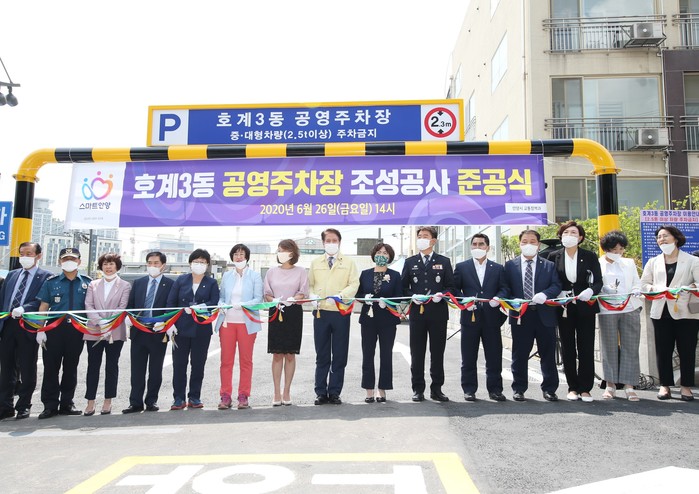 경기 안양시 호계3동 공영주차장 준공식이 26일 최대호 시장을 비롯해 유관기관 단체장과 지역주민 60여명이 참석한 가운데 테이프커팅과 주차장을 둘러보는 것으로 간소하게 개최됐다. 사진은 최 시장(가운데)과 관계자들이 테이프커팅을 하는 모습. (사진제공=안양시청)