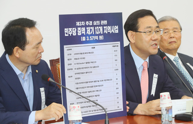 미래통합당 주호영 원내대표가 2일 국회에서 열린 비상대책위원회의에서 제3차 추경 심의 관련 민주당이 증액 제기한 지역사업에 대해 지적하고 있다.