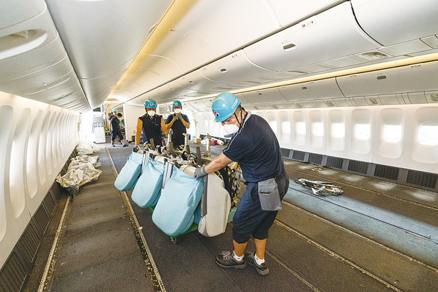 대한항공이 8일 화물 수송을 위해 개조 작업을 완료한 보잉777-300ER 기종을 처음으로 화물 노선에 투입하며 적극적으로 공급 확대에 나섰다. 코로나19 이후 일부 외국 항공사들이 여객기를 개조해 화물을 수송하고 있지만 국내에서는 대한항공이 처음이다.