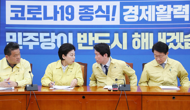 31일 오전 서울 여의도 국회에서 열린 더불어민주당 코로나19 국난극복위원회 실행위원회 회의에 이인영 총괄본부장(원내대표)과 남인순 부위원장이 대화하고 있다.