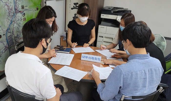 경기 동두천시 소요동행정복지센터 맞춤형복지팀이 3일 지역내 복지사각지대 위기가구의 다양한 복지욕구 해결 방안을 논의하기 위한 내부사례회의를 개최했다. 사진은 팀원들이 기존 사례관리 대상가구의 욕구에 따른 서비스 지원의 적합성과 적정성에 대한 의견을 교환하는 모습. (사진제공=동두천시청)