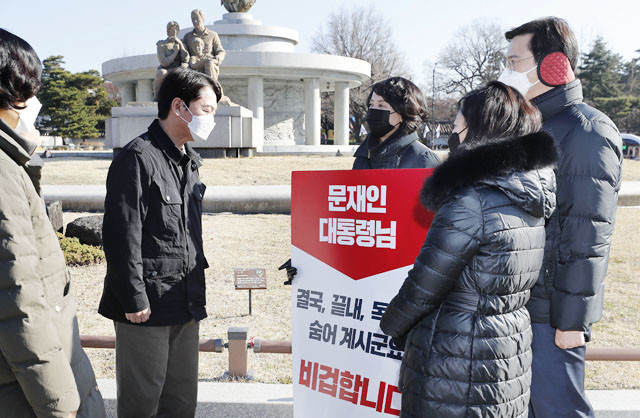 국민의당 안철수 대표가 1일 청와대 분수대 앞에서 릴레이 1인 시위를 하고 있는 국민의힘 강민국, 이영, 황보승희 의원 등을 격려하고 있다.