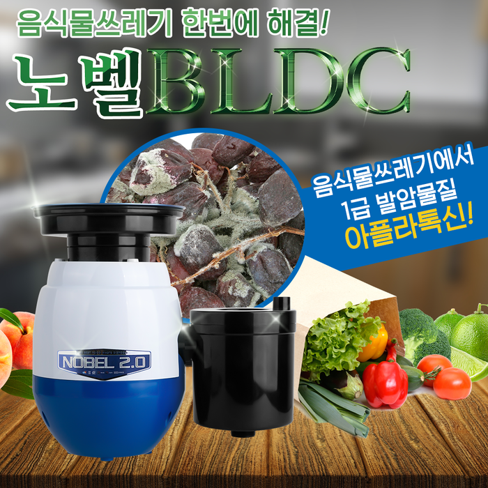 ”노벨BLDC“ 고성능 싱크대 음식물처리기에 사용되는 최신 성능에 BLDC모터는 전기 소모량이 많지 않고 자동 역회전을 할 수 있어 음식물 찌꺼기가 걸리는 일을 방지할 수 있다. 노벨BLDC 가정용 음식물분쇄기는 숟가락, 젓가락 등이 투입구에 들어갈 때 이를 튕겨내거나 자동으로 작동이 중단되는 안전장치가 설계되어 있으며 발판 외의 유무선 리모컨을 제공해 손쉬운 조작과 양방향 제어가 가능하다.