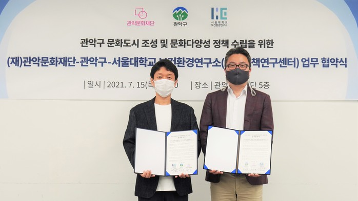 관악문화재단은 15일 관악구, 서울대학교 보건환경연구소 인구정책연구센터와 ‘관악구 문화도시 조성 및 문화다양성 정책수립을 위한 업무협약(MOU)’를 체결했다. 주요 협약 내용은 관악구 문화다양성 인식 및 수용 실태 연구 공동사업 추진 등이다. 사진은 업무협약식에서 관계자들이 기념촬영을 하는 모습. (사진제공=관악문화재단)