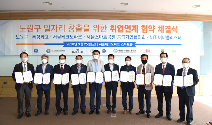 서울 노원구는 최근 구민 일자리 창출 문제 해결을 위해 노원구·특성화고·(재)서울테크노파크·서울스마트공장 공급기업 협의회·NIT 미니클러스트 등 5자간 업무협약을 체결했다. 사진은 협약식에서 오승록 구청장(왼쪽 다섯 번째)과 관계자들이 기념촬영을 하고 있는 모습. (사진제공=노원구청)