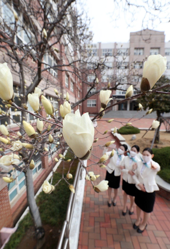 개구리가 잠에서 깨는 경칩(驚蟄)을 하루 앞둔 4일 대구 북구 영진전문대학교 교정에 목련이 활짝 펴 눈길을 끌고 있다.