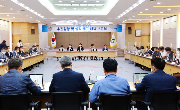 충남 서산시가 25일 시청 대회의실에서 '정부 위임사무 평가 추진상황 및 실적 제고 대책 보고회'를 열고 올 상반기 실적을 점검했다. 위임사무는 국가주요시책에 대한 업무 권한을 자치단체에 위임한 사무로, 매년 중앙행정기관 및 충남도에서 시·군 평가가 이뤄진다. 이날 맹정호 시장이 보고회를 주재했으며, 관련 부서장 33명과 실적 점검 및 향후 추진 방향 등을 논의했다. 사진은 보고회 진행 모습. (사진제공=서산시청)