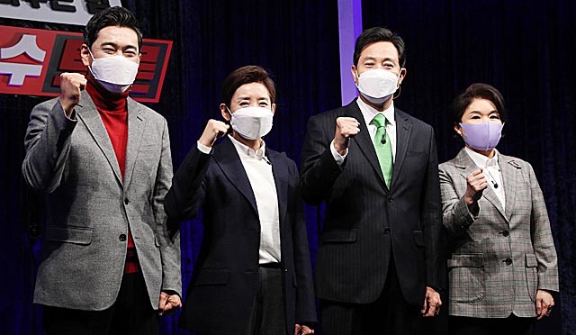 국민의힘 오신환(왼쪽부터), 나경원, 오세훈, 조은희 서울시장 경선후보가 23일 서울 용산구 백범김구기념관에서 열린 3차 맞수토론에 앞서 기념촬영하고 있다.