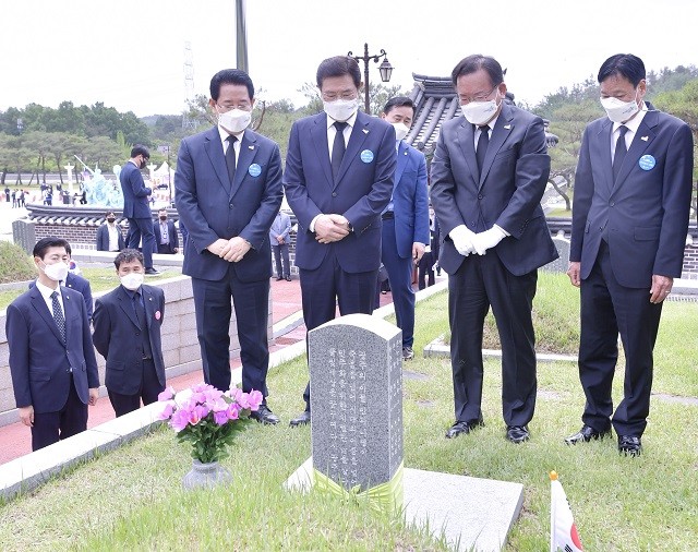 [광주=정찬남 기자] 김부겸 국무총리, 이용섭 광주광역시장, 김영록 전남도지사, 권영진 대구광역시장 등 주요내빈들이 18일 오전 북구 운정동 국립5·18민주묘지에서 열린 '제41주년 5·18민주화운동 기념식'에 참석해 묘역을 참배를 하고 있다./광주광역시 제공