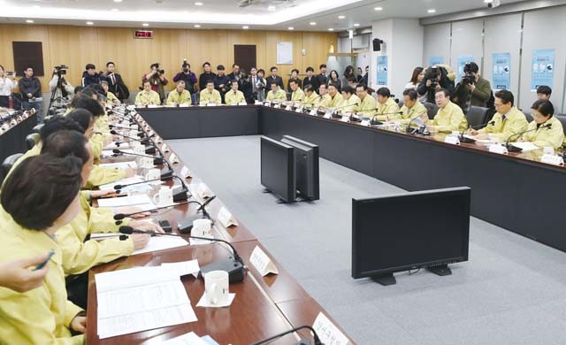 박원순 서울시장이 29일 오후 서울시청에서 서울시 자치구 구청장들이 참석한 가운데 신종 코로나바이러스 감염증 종합대책회의를 주재하고 있다.