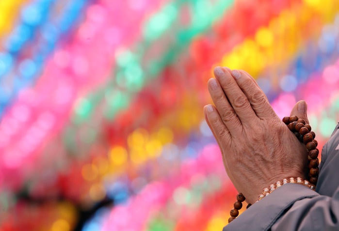 불기 2564년 부처님 오신날인 30일 서울 종로구 견지동 조계사에서 열린 '부처님 오신날 봉축 및 코로나19 극복과 치유를 위한 기도 입재식'에서 신도가 합장하고 있다.