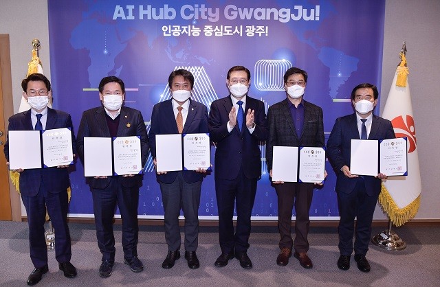 [광주=정찬남 기자] 이용섭 광주광역시장이 9일 오후 시청 접견실에서 광주광역시 자치경찰위원회 구성을 위한 위원추천위원회 위원들에게 위촉장 수여한 뒤 기념촬영을 하고 있다. 왼쪽부터 문영훈 광주광역시 기획조정실장, 김병내 남구청장, 박희율 남구의회의장, 이용섭 광주광역시장, 양성진 전 광주경찰청 1부장, 성종수 광주지방법원 형사과장/광주광역시 제공