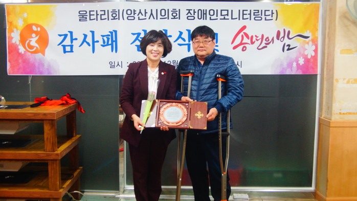 울타리회(양산시의회장애인모니터링단)는 평소 장애인 복지향상에 대한 관심과 수고를 아끼지 않은 정숙남의원에게 깊이 감사드린다며 감사패를 수여하였으며, 정숙남 의원은 수여식에서 “앞으로도 사회적 약자를 위한 시민의 대변자로의 의정활동에 더욱 매진하겠다”고 말했다.