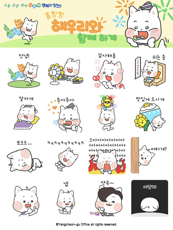 [시민일보 = 이대우 기자] 서울 양천구(구청장 김수영)는 14일 오후 2시부터 카톡 채널 ‘양천구청’을 추가하는 구민 2만5000명을 대상으로 ‘볼빵빵 해우리’ 이모티콘을 선착순 배포한다.