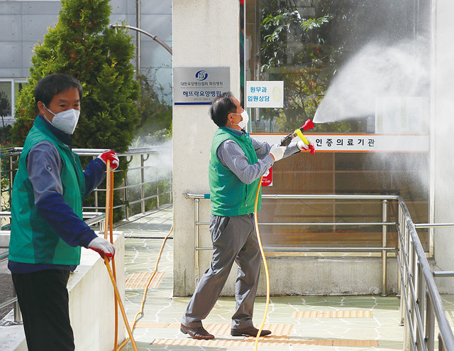 14일 오전 부산 북구 만덕동 해뜨락 요양병원에서 방역 관계자가 소독을 하고 있다. 이 요양병원은 직원 9명과 환자 43명이 코로나19 확진 판정을 받아 동일집단 격리에 들어갔다.