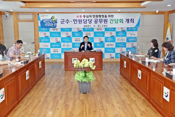전남 장흥군이 최근 군청 상황실에서 민원 담당 공무원을 대상으로 정종순 군수와 함께하는 민원 담당 공무원 간담회를 개최했다. 이날 간담회는 민원창구 직원들의 애로사항과 창구 근무 시 발생하는 다양한 문제점을 청취하고, 개선 방향을 모색하기 위해 마련됐다. 사진은 정 군수(가운데)가 간담회를 주재하는 모습. (사진제공=장흥군청)