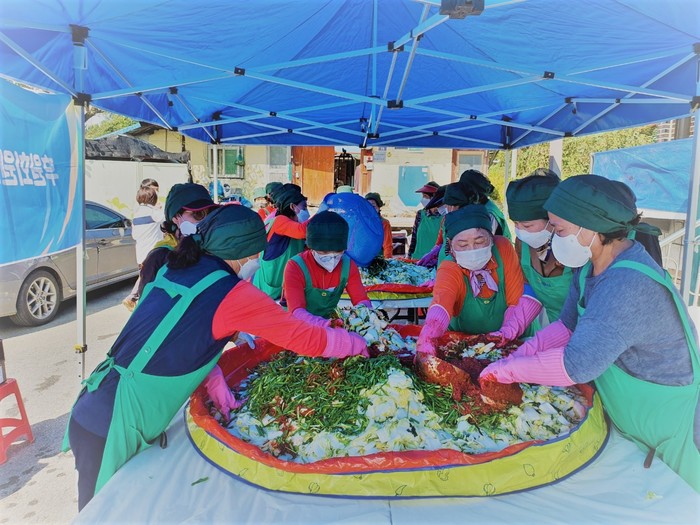 경기 양평군 양평읍 새마을회는 지난 6월부터 총 4회에 걸쳐 배추김치와 얼갈이김치 등을 직접 담가 마을별 어려운 이웃 200가구에 전달했다. 사진은 14일 회원들이 양평읍 창대3리 마을회관 일원에 모여 김치를 담그고 있는 모습. (사진제공=양평군청)