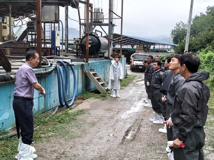 전남 장흥군은 22일 가축분뇨 처리에 따른 악취문제 해소를 위해 경남 밀양시 무안면에 위치한 축산농장을 견학했다. 이날 견학에는 장흥군축산사업소장, 축산단체협의회 축종별 대표, 지역내 액비전문유통센터 관계자가 참석했다. 사진은 참여자들이 악취저감시설을 살펴보는 모습.(사진제공=장흥군청)