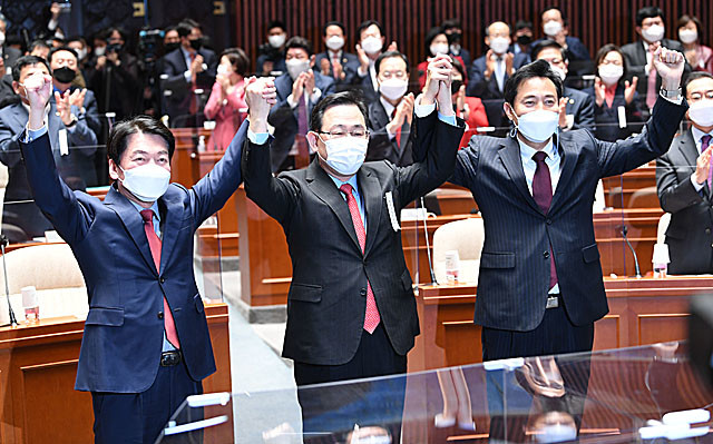 국민의힘 오세훈 서울시장 후보가 24일 서울 여의도 국회에서 열린 의원총회에서 자신의 선거운동에 힘을 보태기로 한 안철수 공동선대위원장, 주호영 원내대표와 손을 들어 포즈를 취하고 있다.