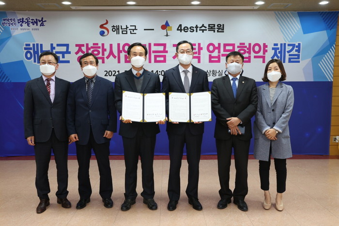 전남 해남군이 최근 포레스트 수목원과 장학사업기금 기탁을 위한 협약을 체결했다. 수목원은 유료입장료 수입의 일정 부분을 해남군 장학사업기금으로 기탁하고, 군은 수목원의 이미지 마케팅에 협력하기로 했다. 사진은 협약식에서 명현관 군수(오른쪽 세 번째)가 관계자들과 기념촬영을 하는 모습. (사진제공=해남군청)