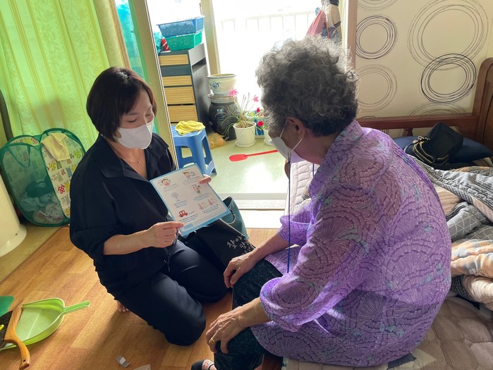 경기 하남시 보건소는 최근 무더위가 시작됨에 따라 건강 취약계층 4294가구를 대상으로 동별 방문간호사가 일일이 건강을 확인하고 주거환경을 살피며, 양산·선캡 등 폭염대응 물품을 전달하고 있다. 사진은 보건소 관계자가 대상 노인가구를 방문해 폭염 대비 건강수칙 등을 교육하고 있는 모습. (사진제공=하남시청)