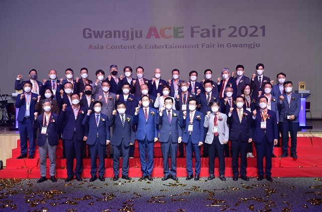[광주=정찬남 기자] 이용섭 광주광역시장(앞줄 좌측부터 6번)이 9일 오후 서구 김대중컨벤션센터에서 열린 2021 광주 에이스페어(Asia Content & Entertainment Fair) 개막식에 참석해 내빈들과 기념촬영을 하고 있다.