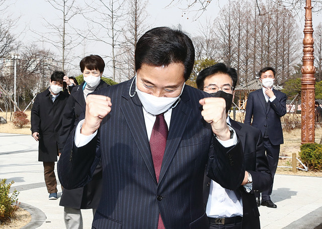 야권 서울시장 보궐선거 단일후보로 선출된 국민의힘 오세훈 서울시장 후보가 23일 국회 소통관에서 소감을 밝힌 뒤 주먹을 불끈 쥐며 기뻐하고 있다.