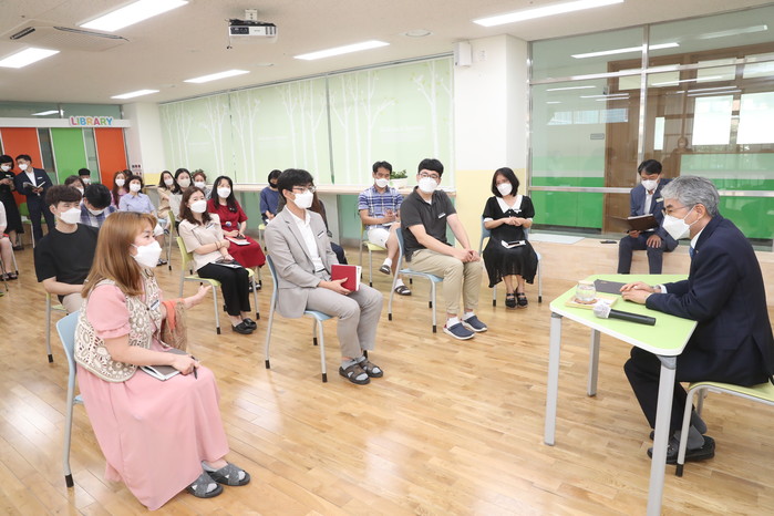 박 교육감과 교무행정팀 간담회에서 김규읍 교사는 “2021년에는 방과후학교실무원이 추가 배치되고, 교육지원청에 학교통합지원센터가 설치되어 2020년에 비해 담임선생님들의 업무를 많이 덜어내어 지원할 수 있게 되었다. 교무행정팀의 지원으로 담임선생님들이 수업준비와 아이들과 소통할 수 있는 시간을 더 많이 가지게되어 뿌듯하다.”는 의견을 밝혔다.