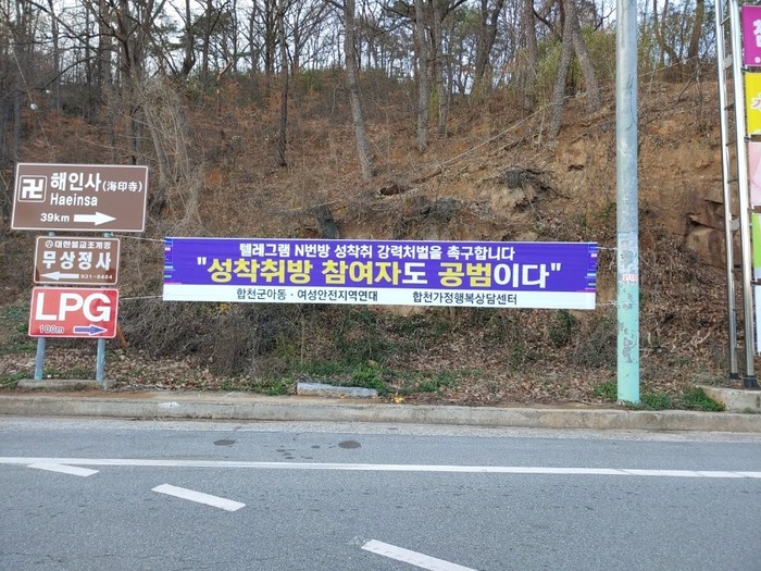 합천군아동‧여성안전지역연대와 합천가정행복상담센터는 군청 회전로터리와 제2합천교→대야로(고령, 해인사방향) 로터리에 ‘텔레그램 N번방 성착취 강력처벌을 촉구합니다’, ‘성착취방 참여자도 공범이다’라는 내용으로 현수막을 게재해 강력처벌의 목소리를 높였다.