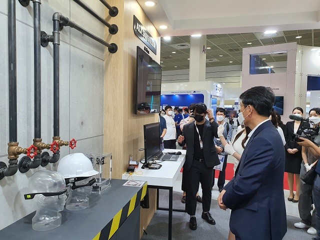 | ▲ 조인철 광주광역시 문화경제부시장이 24일 서울 삼성동 코엑스에서 열리고 있는 ‘스마트테크 코리아 2021'의 광주 공동홍보관을 둘러보고 있다./광주광역시 제공 |