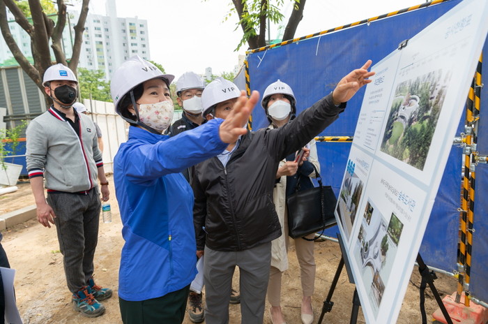 김수영 서울 양천구청장이 4일 신정6동 양천근린공원 리모델링 공사 현장을 방문해 현장을 시찰하고 관계자들에게 안전을 당부했다. 사진은 김 구청장이 공사 관계자로부터 현황을 설명 듣고 있는 모습. (사진제공=양천구청)