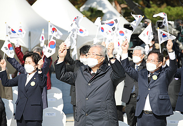 국민의힘 김종인 비상대책위원장이 3일 광주광역시 서구 학생독립운동기념탑에서 열린 제91주년 학생독립운동 기념식에서 참석자들과 만세삼창을 하고 있다. 이날 만세삼창은 1943년 무등독서회를 조직했다가 옥고를 치른 이석규 애국지사와 후배 학생들의 선창으로 진행됐다.
