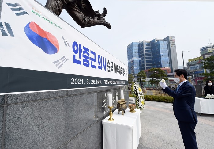 경기 의정부시는 안중근 의사 순국 111주기를 맞아 26일 의정부 역전근린공원내 안중근 의사 동상 앞에서 추모 의식행사를 열었다. 추모식은 안중근 의사 최후의 유언 낭독, 헌화·분향 및 묵념 순서로 진행됐다. 사진은 추모식에서 안병용 시장이 헌화를 하는 모습. (사진제공=의정부시청)