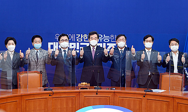 더불어민주당 이낙연 대표, 김태년 원내대표와 최고위원들이 2일 오전 서울 여의도 국회에서 열린 최고위원회의에서 ‘2020 코리아세일페스타’ 성공을 기원하고 있다.