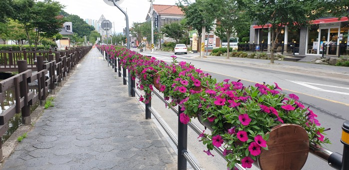 그동안 인도의 좁은 공간에 폭 90㎝의 화분에 화초를 심고 가꾸어 보행에 지장을 주었던 것을 이번에 휀스에 설치할 수 있는 걸이화분으로 일괄 교체해 보행자의 편의와 시가지 경관을 개선하고 꽃이 어우러진 아름다운 거리를 조성했다.