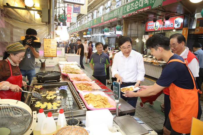 이동진 서울 도봉구청장은 명절을 앞두고 지난 9일 지역내 도깨비시장, 쌍문시장, 신창시장, 골목시장, 백운시장 등을 순회하며 직접 장을 보고 주민들과 소통했다. 사진은 도깨비시장에 방문한 이 구청장이 장을 보고 있는 모습. (사진제공=도봉구청)