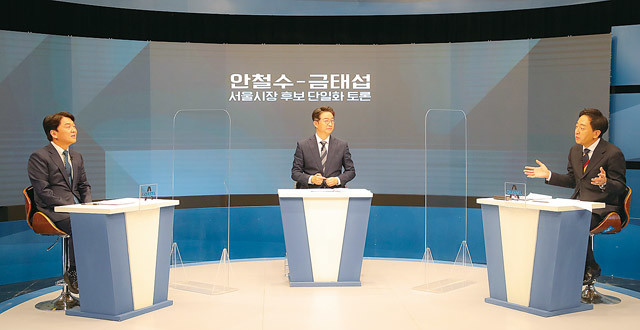 서울시장 재보궐 선거에 출마한 국민의당 안철수 예비후보(왼쪽)와 무소속 금태섭 예비후보(오른쪽)가 18일 상암동 채널에이 사옥에서 열린 단일화를 위한 토론을 하고 있다.
