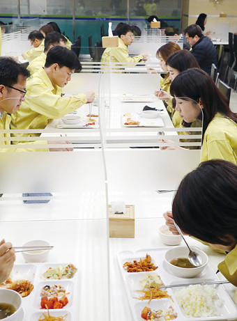 정부가 코로나19 확산 예방을 위해 약 2주간 고강도 사회적 거리두기 실행을 강조했다. 23일 자리마다 유리격벽이 설치된 서울 성동구청 구내식당에서 구청 직원들이 식사하고 있다.