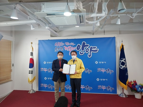 | ▲ 공유기업 지정식 (좌)캐어유 신준영 대표, (우)안양시 최대호 시장, 제공=캐어유 |