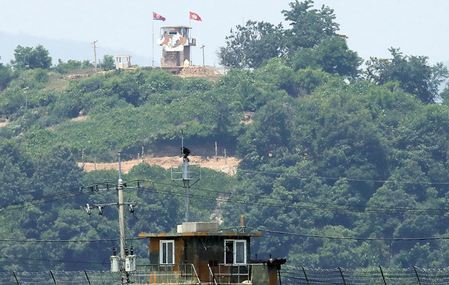 17일 경기 파주시 접경지역 임진강변 우리 측 초소와 마주보고 있는 북한군 초소에 인공기와 최고사령관기가 걸려 있다.