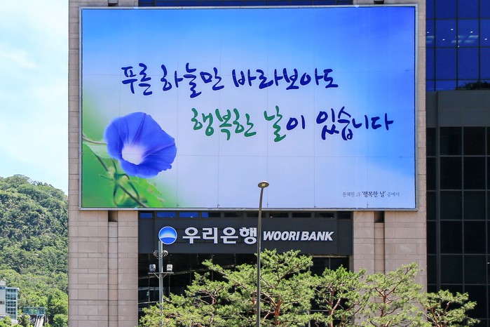 우리은행을 거래하는 한 고객은 “우리은행 본점 빌딩은 지리적으로도 서울 중구 회현동 남산자락에 위치하고 있어 건물 외벽에 게시된 글판은 남산과도 절묘하게 어울린다”라고 말했다.