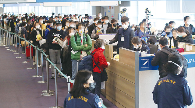 신종 코로나바이러스 감염증(코로나19)의 유입을 막기 위해 모든 입국자에 ‘특별입국절차’를 적용하기 시작한 19일 오전 독일 프랑크푸르트 등에서 출발해 인천국제공항 1터미널에 도착한 탑승객들이 검역소를 통과하기 위해 줄을 서있다.