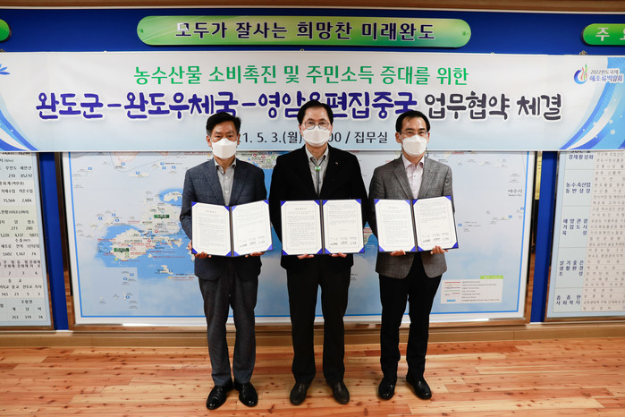 전남 완도군이 3일 완도우체국, 영암우편집중국과 농·수산물 소비 촉진을 위한 택배 운송 체계 개선에 대한 업무 협약을 체결했다. 이날 협약을 통해 군과 우체국은 명절 특수기 노화, 보길권역 주민들이 우체국택배를 이용함에 있어 불편함을 최소화할 수 있도록 관심을 갖고 택배 차량 최대 확보 및 배차, 우체국 물류시설 개선 등에 적극 협력하기로 했다. 사진은 이날 협약식에서 신우철 군수(가운데)가 양 기관 관계자들과 기념촬영을 하는 모습. (사진제공=완도군청)
