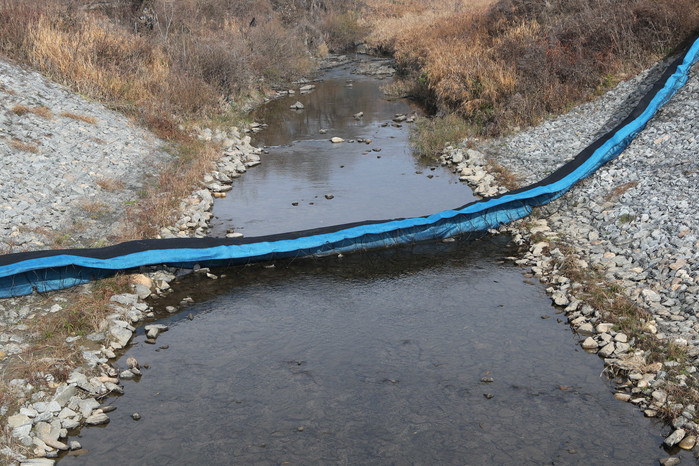 아프리카돼지열병(ASF) 확산을 막기 위해 살처분 작업을 진행하다가 트럭에 쌓아둔 수만 마리 돼지 사체에서 핏물이 새어 나와 경기도 연천군의 임진강 지류 마거천을 일부 오염시키는 사고가 났다. 지난 10∼11일 많은 비가 내리면서 돼지 사체 핏물이 빗물과 함께 흘러 임진강 지류 마거천과 연결된 실개천으로 흘러들었다. 경기도와 연천군은 긴급히 오염수 펌핑 작업과 펜스를 설치했으나 일부는 이미 마거천을 통해 임진강으로 유출됐다. 사진은 12일 마거천에 설치된 펜스의 모습.
