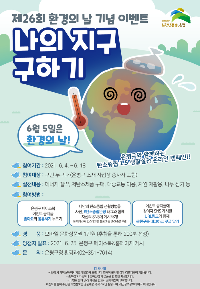 [시민일보 = 이대우 기자] 서울 은평구(구청장 김미경)는 제26회 환경의 날(6월5일)을 맞아 탄소중립 1.5 생활실천 「나의 지구 구하기」 캠페인을 이달 4~18일 온라인으로 전개한다고 밝혔다.